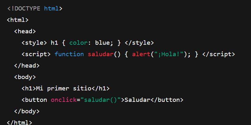 Ejemplo práctico: HTML pone un botón, CSS le da color y forma, y JavaScript hace que funcione cuando haces clic.
